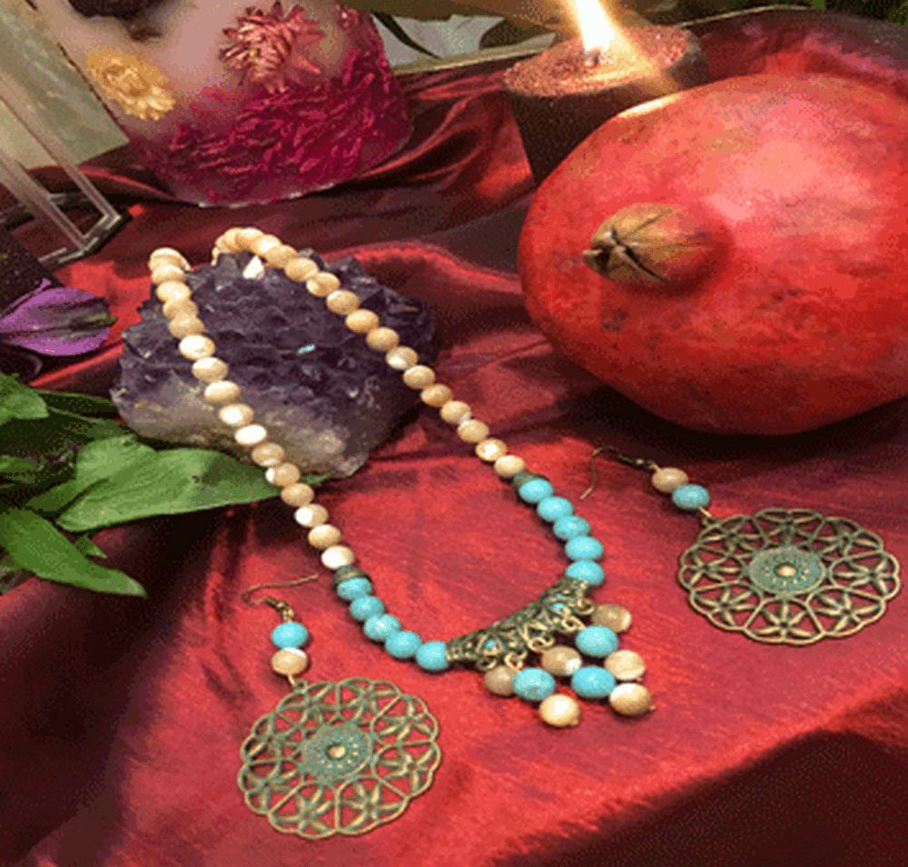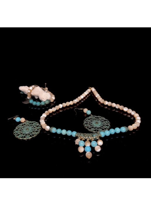 جزئیات: نیم ست طرح سنتی فیروزه تبتی وصدف با خرج کار پتینه